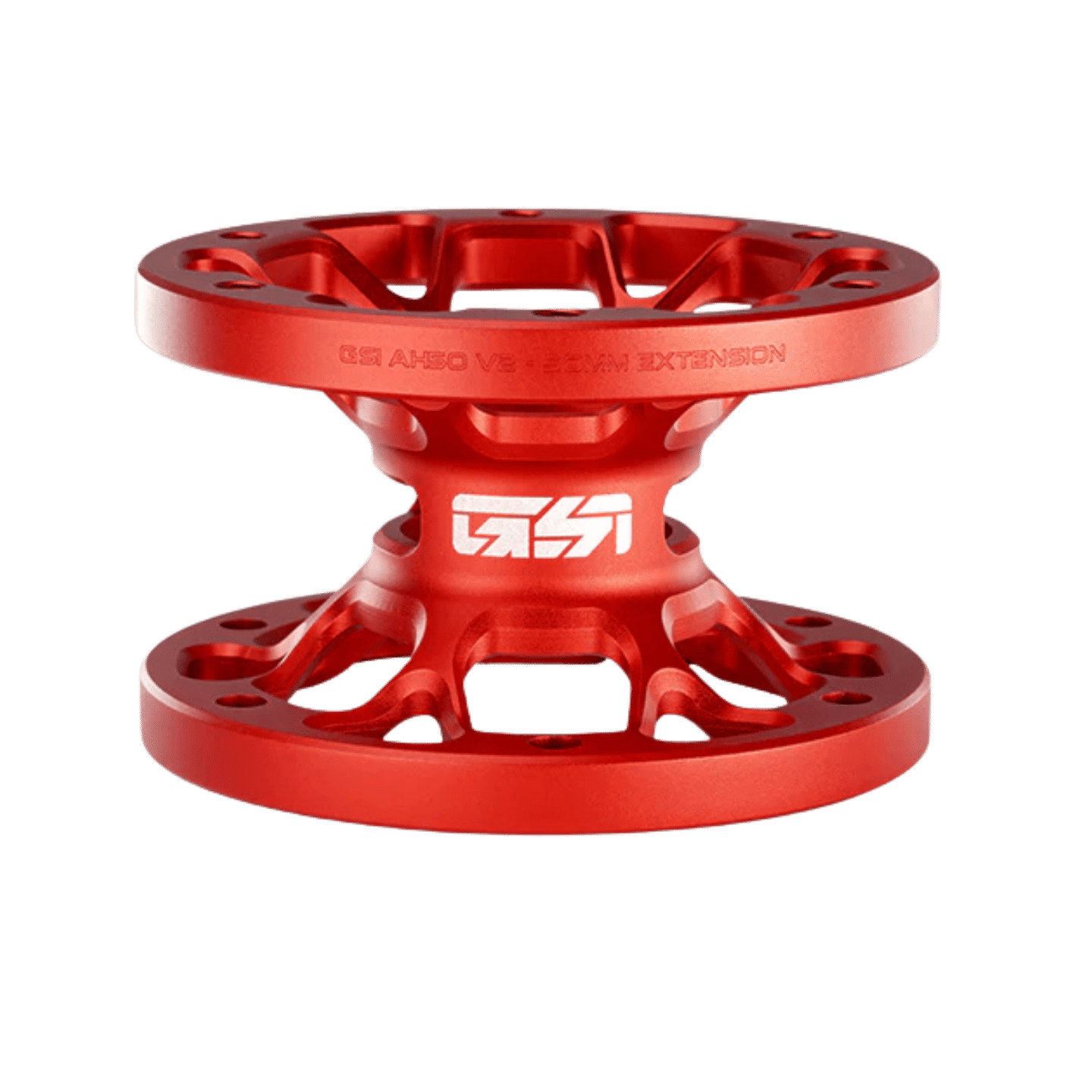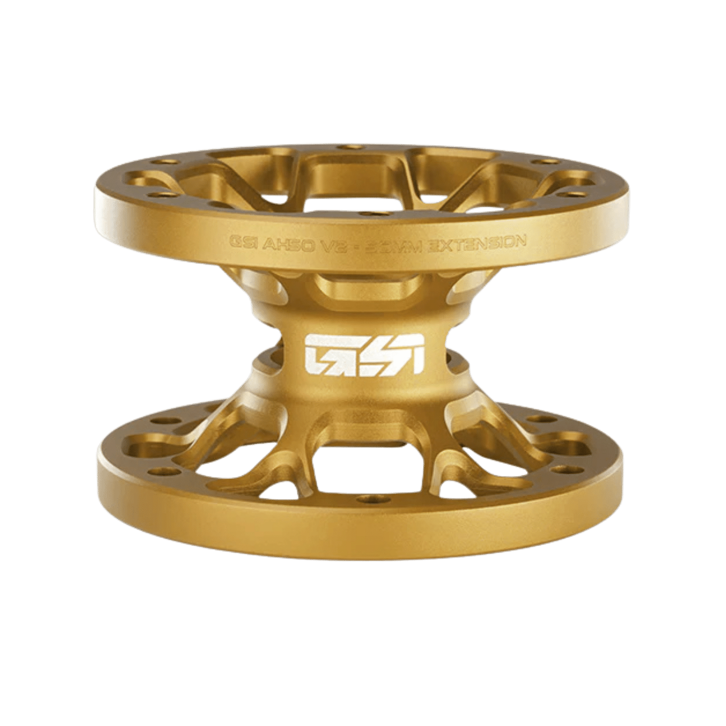 The GSI AH50 hub extension is the perfect add on to your GSI wheel. It extends the shaft by 50mm. Each side uses a 70mm bolt pitch pattern that directly connects to all DD bases on the market. One side has fully thread holes while the other side has all non threaded holes to allow for any combo of connections to wheels and bases. Constructed out of billet 6061 aluminum with models anodized in Gold, Black and Red.