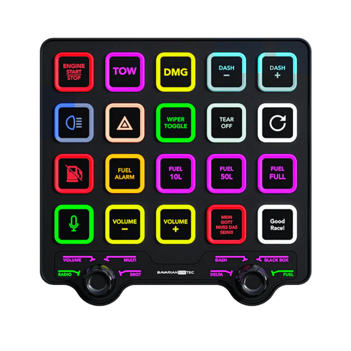 The BavarianSimTec ControlCenter is a premium sim racing button box designed to put total control directly at your fingertips. Precision-machined in Bavaria from solid CNC aluminum, it combines 20 RGB backlit buttons, dual rotary encoders, and an integrated USB-C hub into a compact command module built for professional-grade cockpits and serious sim racers.