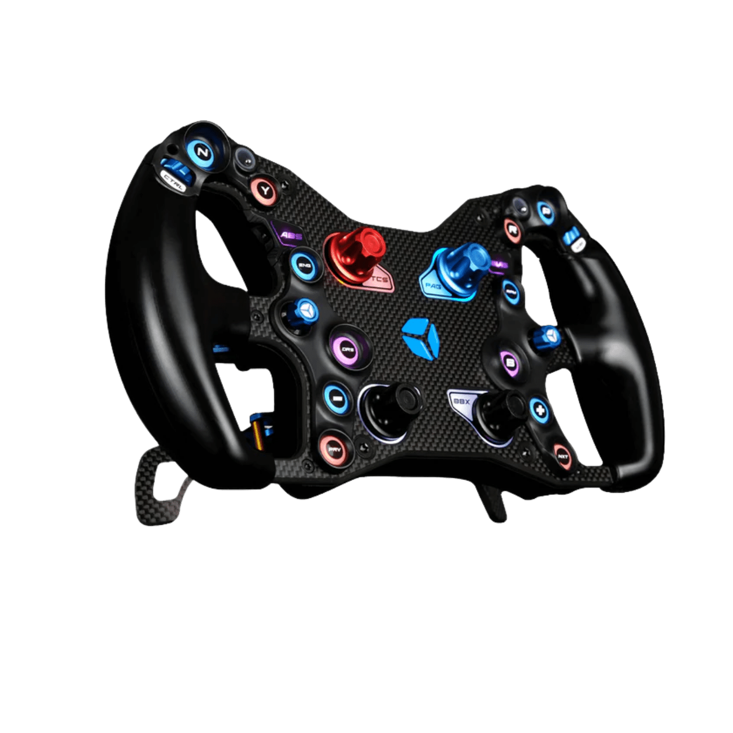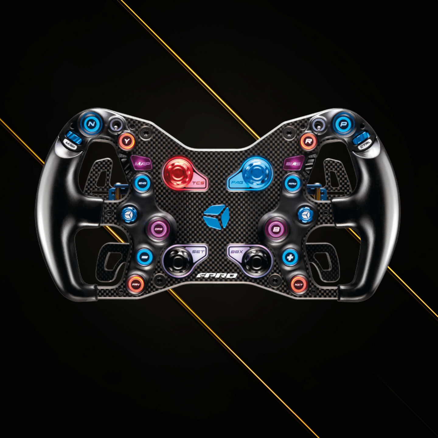Discover our Cube Controls F-PRO. This updated Formula steering wheel features a USB+Bluetooth Dual-Mode connection and completely customizable RGB Backlit buttons giving you an unprecedented level of freedom. Featuring double joystick, magnetic connectors, custom-designed magnetic switchless shifter paddles with adjustable stop ends, ball bearing and improved tactile feedback. 100% Carbon Fiber front plate. Die-cast aluminum mainbody.
