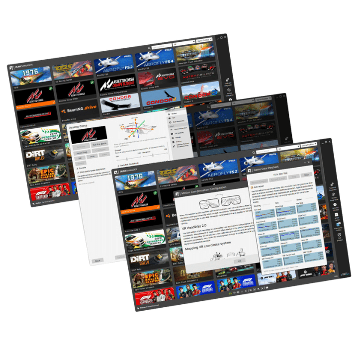 Qubic Manager is a in-house professional and specialized software for motion platforms. It is plug-and-play compatible with all major racing and flight titles on PC and is continually updated to support new titles as they are released. The Qubic Manager is a powerful engine, yet it’s simple to use, allowing you to easily adjust levels of motion, bumps, roll, and pitch with a click of a button.