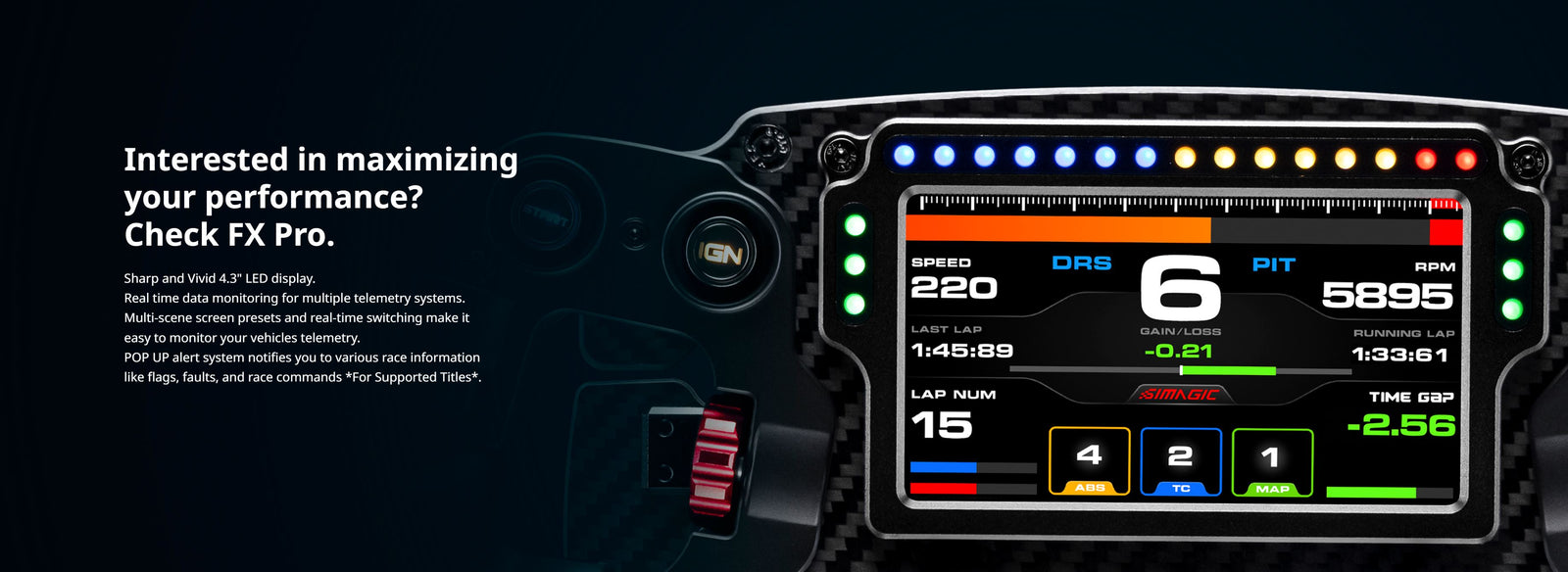 Introducing the full carbon fibre construction, redefining a lightweight wheel body, with sharp and vivid 4.3″ LED display, constructed for the ultimate racing experience. Discover your potential with FX Pro!