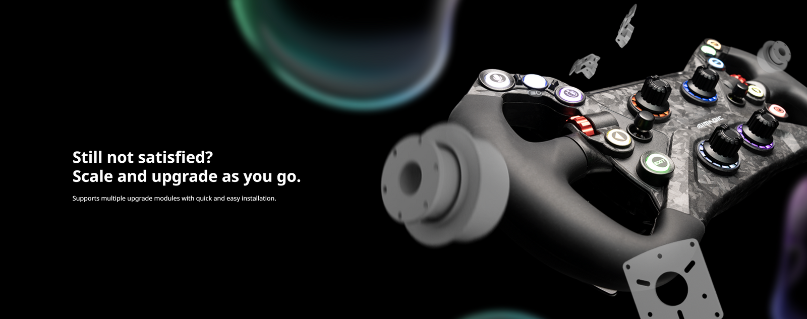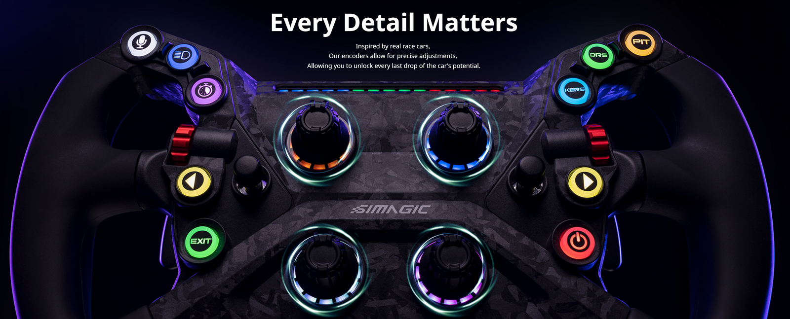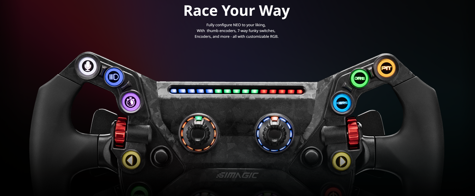 Introducing the Simagic GT Neo, a game-changer in sim racing steering wheels. Designed for comfort with an ergonomic build, it features 2 aluminum thumb encoders, 2 7-way switches, and 4 rotary encoders for precise control. Personalize your setup with 10 RGB buttons. Crafted with carbon fiber composites, it’s lightweight yet robust. Elevate your racing experience with the Simagic GT Neo.